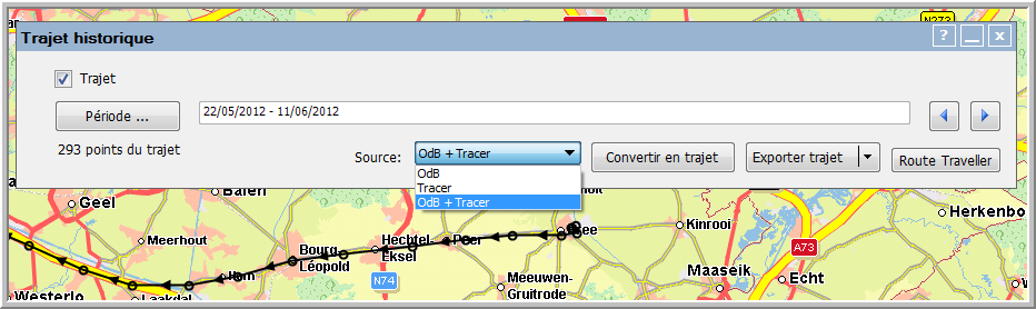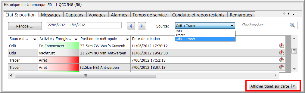 Pour ces clients, les données OdB et Tracer sont combinées dans l'onglet État & Position du module "Suivi véhicules". Si vous sélectionnez une remorque avec un Tracer dans l'information en temps réel, l'utilisateur peut sélectionner la source données voulue pour affichage dans l'aperçu historique :