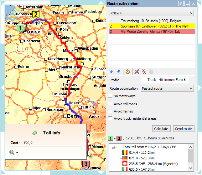 Remarque: Depuis le 1ier avril 2016, une taxe kilométrique est en vigueur pour les poids lourds de plus de 3,5 tonnes (plus d'info). La version 11.27 de TX-CONNECT la prend en compte.