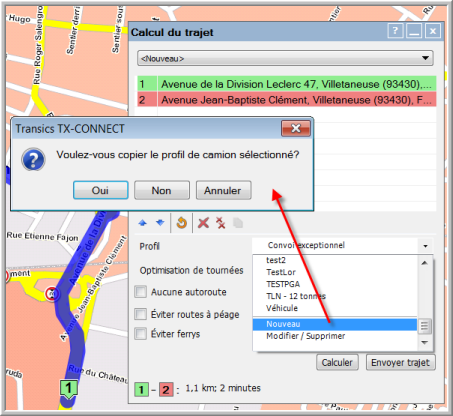 Sélectionnez Nouveau dans le menu déroulant de la fenêtre Calcul du trajet.
