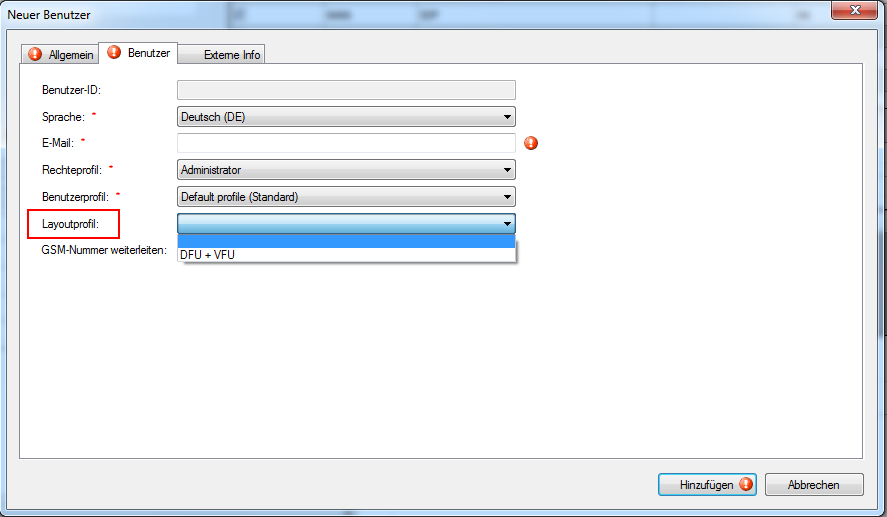 Bitte bemerken Sie, dass Sie ein Layoutprofil nur zuweisen können, wenn Sie einen NEUEN Benutzer erstellen (nur für Verwalter verfügbar).