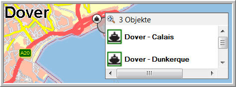 Die Fähren und Züge werden angezeigt, ab der Hälfte des Zoomreglers. Wenn es verschiedene Optionen gibt, werden die Symbole auf Karte gruppiert.