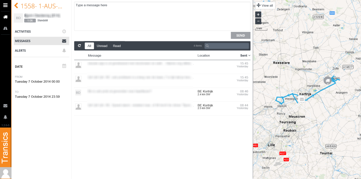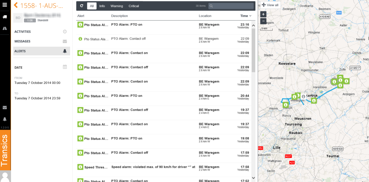 the details screens (Vehicle Follow-up, Alarms or Messages), the user